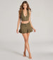 A mini skort that features a high-rise belted waist. a form-hugging fit. and a pleated mini-length hem....