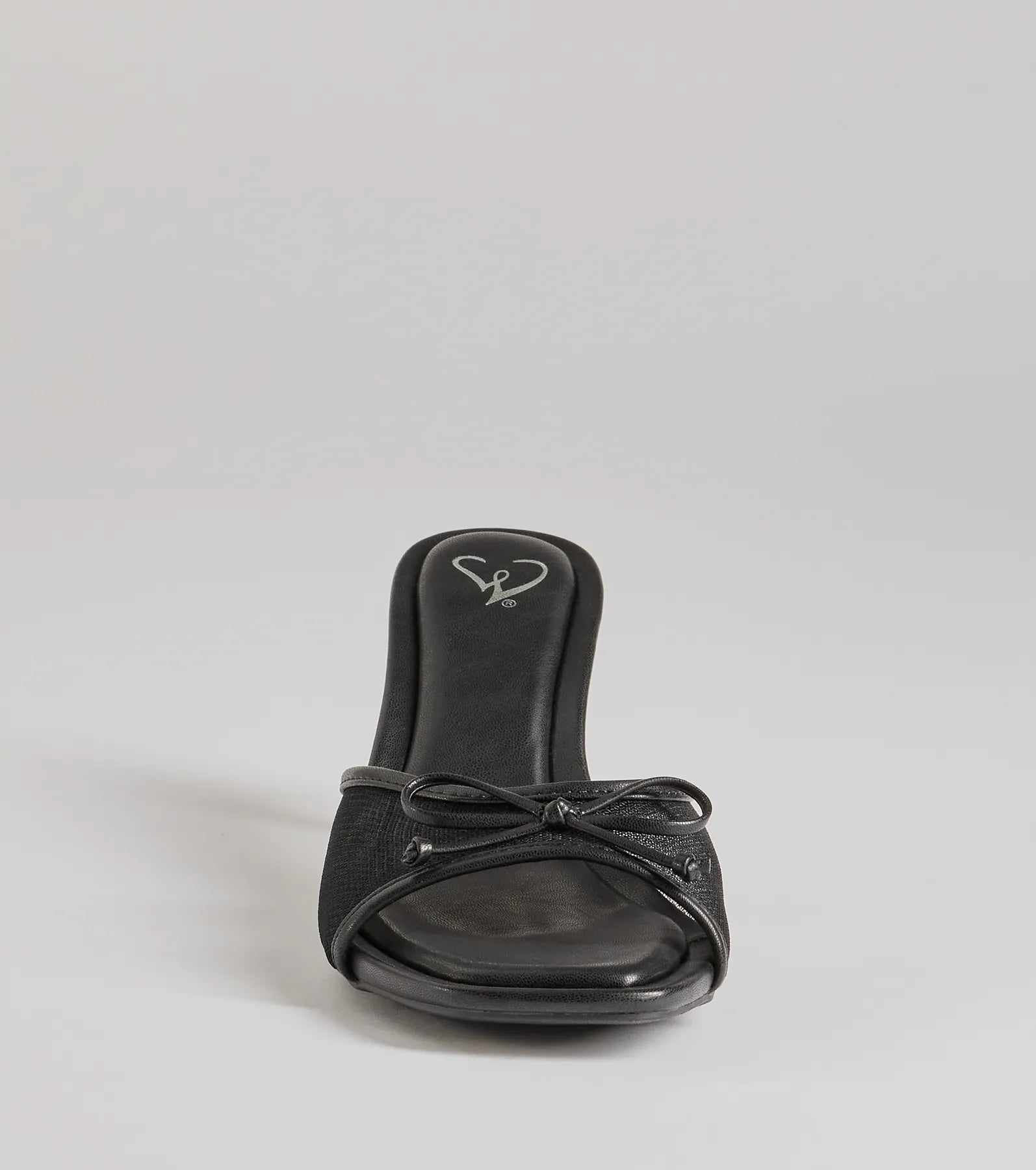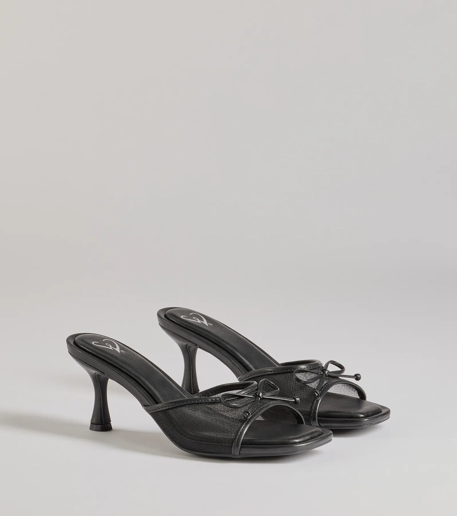 Fit & Features Stiletto heel Open square toe Wide sheer mesh toe strap. bow detail Open back....