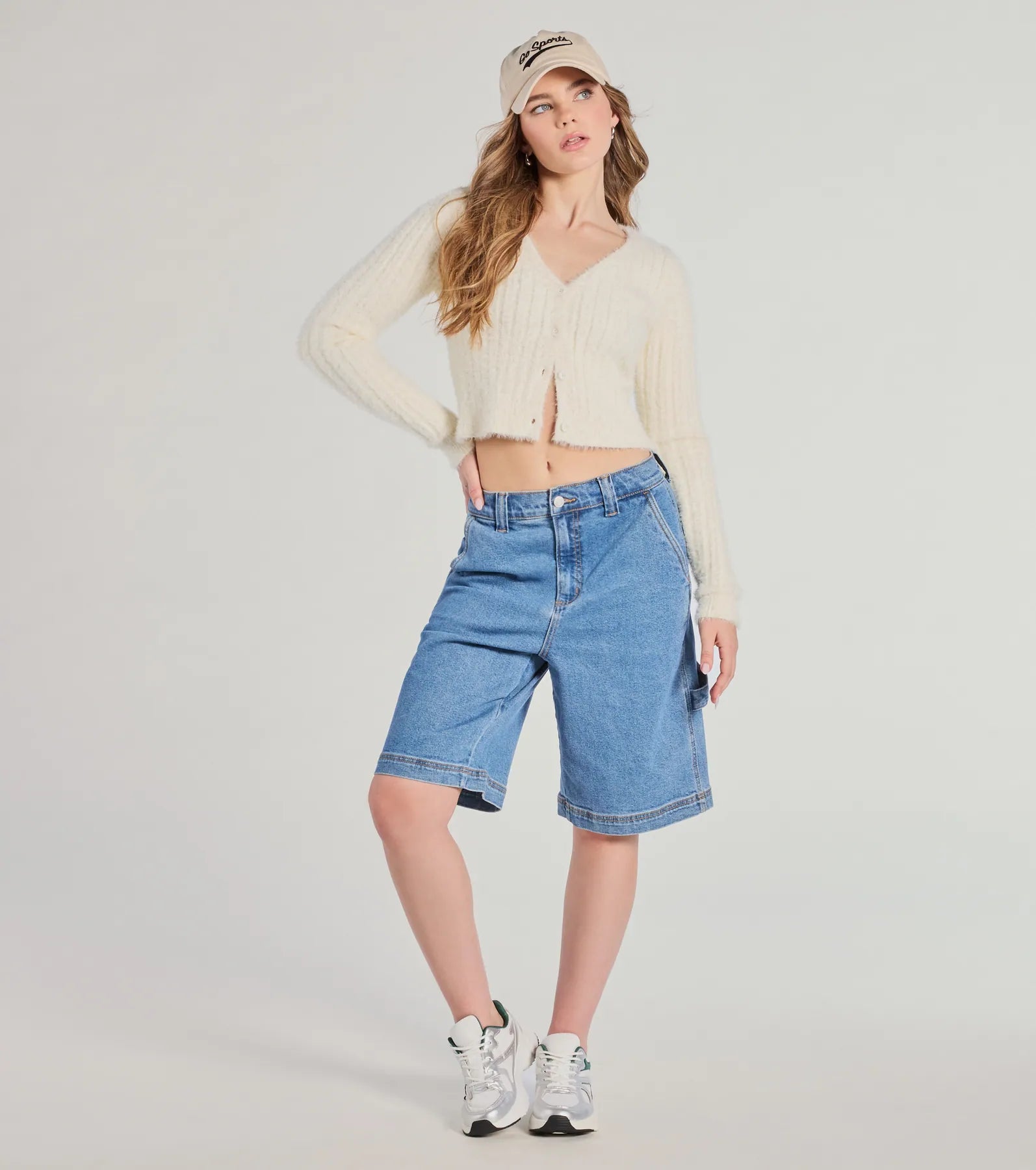 Get cozy in this eyelash knit button-down cardigan sweater. With a V-neck. long sleeves. and fitted cropped...