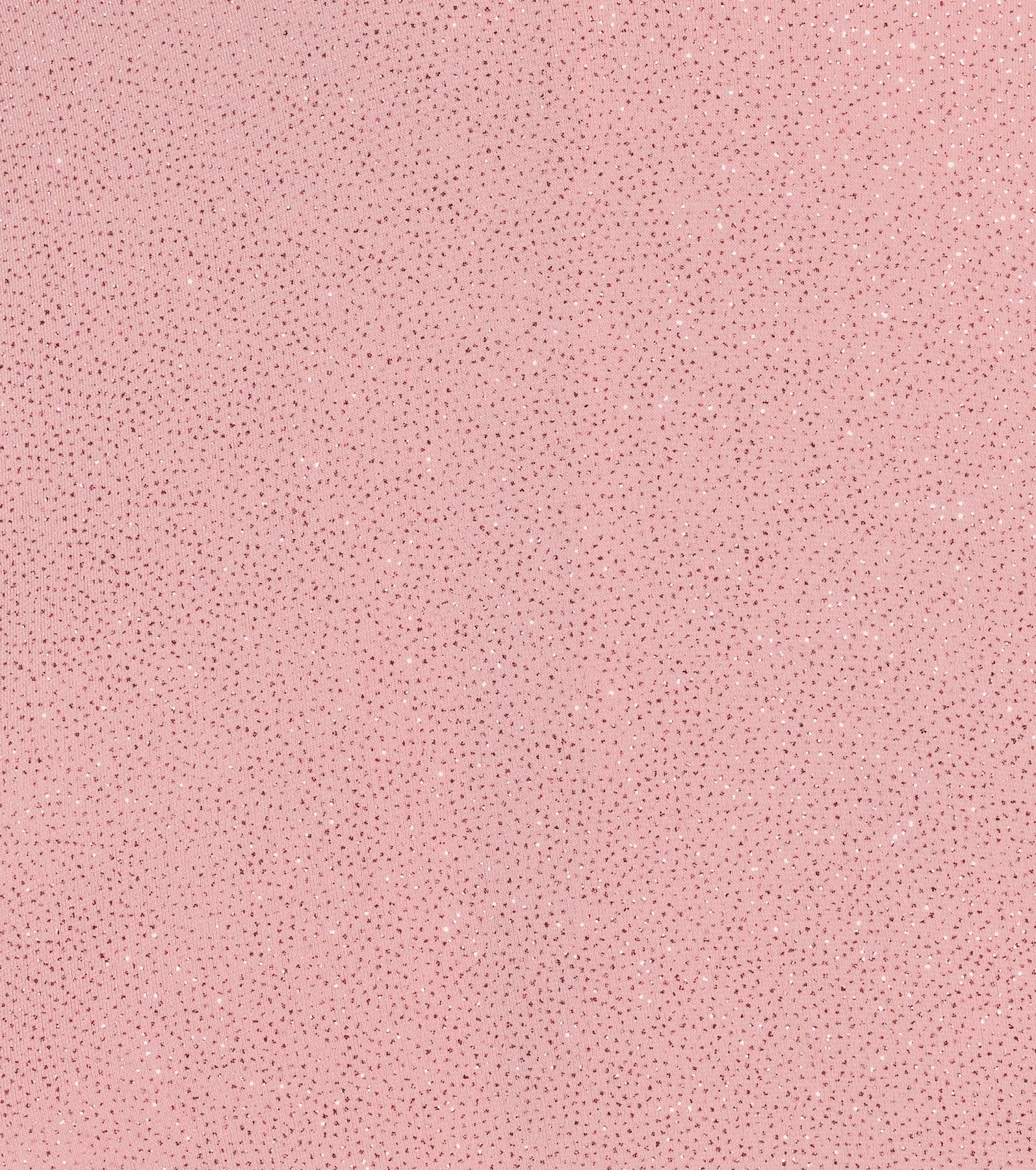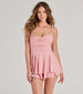 A sleeveless glitter romper features a cowl neckline and a flattering layered skater silhouette perfect for all-night...