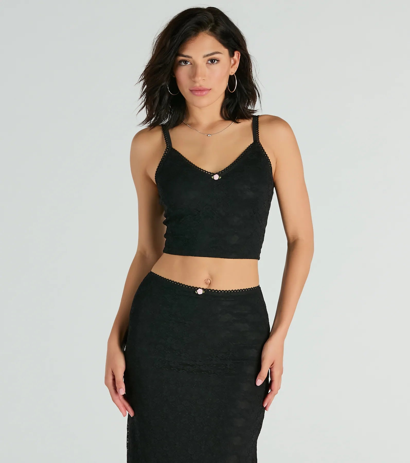 You'll captivate everyone in this alluring lace crop top for an effortless dreamy look at dinner! With...