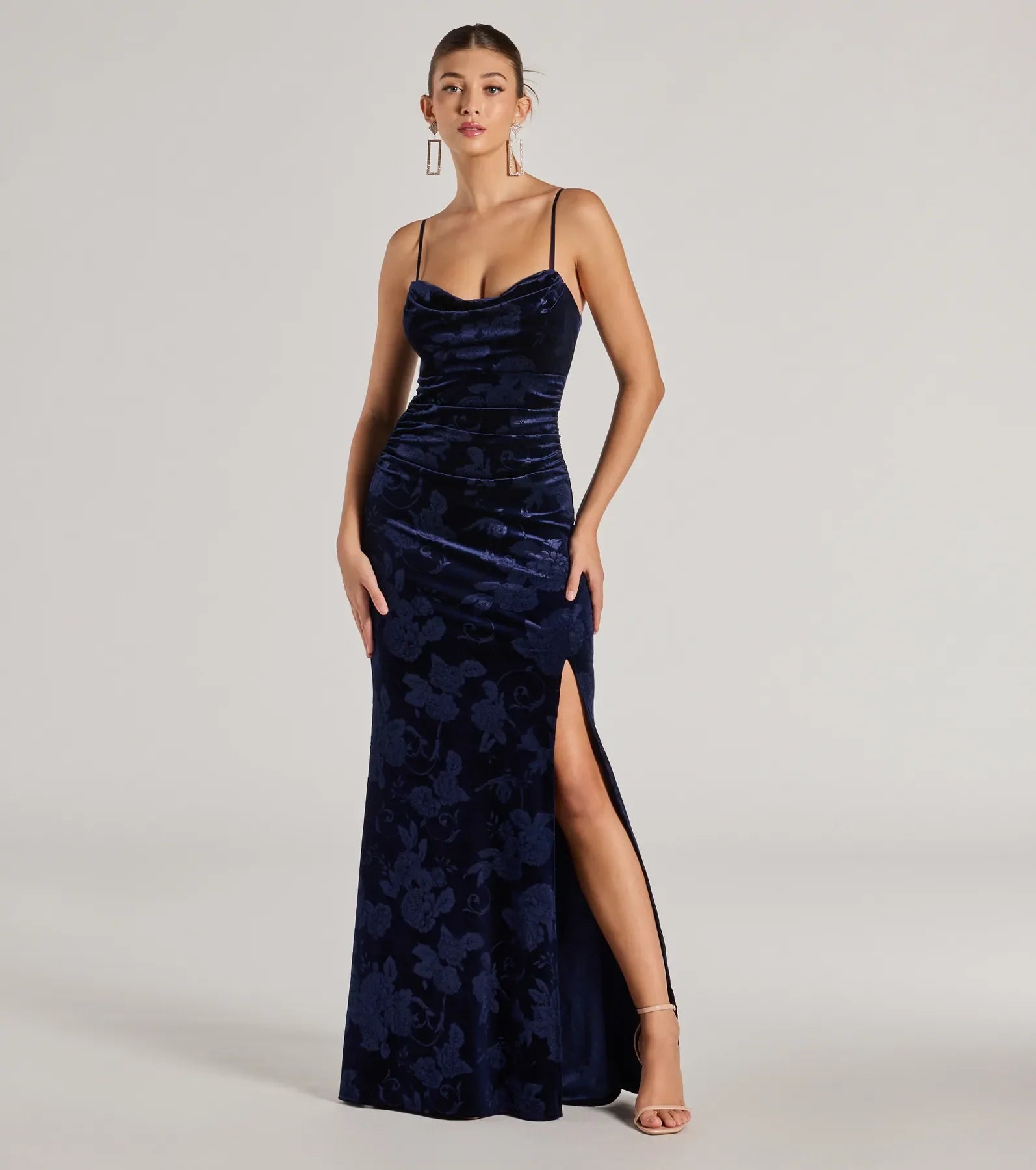 Special OccasionMake a striking impression in a long velvet dress that features a sleeveless cowl neckline. adjustable...
