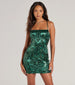 Special OccasionA sequin satin mini dress features a flattering square neckline. spaghetti straps that lead to a...