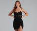 Flirt and flounce in the Breanna party dress perfect for all-night dancing! She features spaghetti straps. a sleeveless V-neck with a built-in padded bust. and a sheer. mesh illusion bodice. Her empire waist leads to a bodycon silhouette with ruched seams to create the appearance of an hourglass figure. The short-length hem has a slit accent and a back zipper closure. She's composed of a crepe-lined knit fabric with an inner lining. Complete your look in this mini dress with glitter heels and a choker.