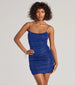 Special Occasion A glitter mini dress features a sultry open back and ruched seams that define your curves...