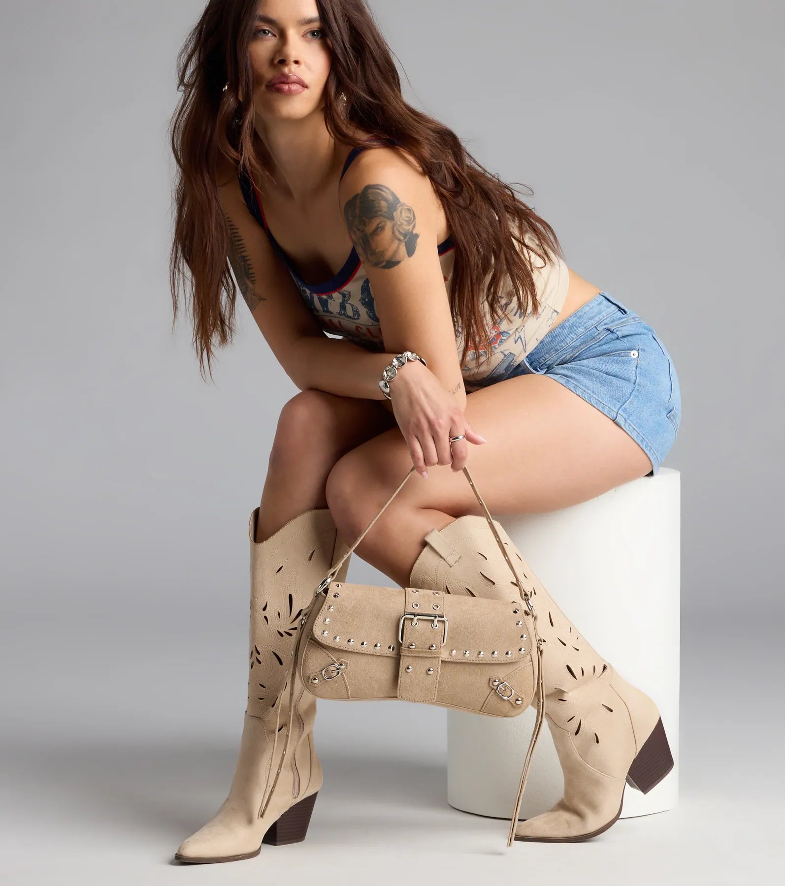 Elevate your outfit with this faux suede shoulder bag with a trendy buckle strap accent. studded trim....