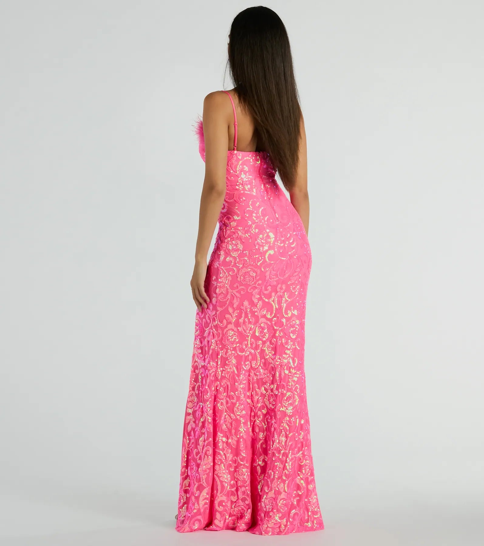 Cara Marabou Trim Mermaid Slit Sequin Formal Dress