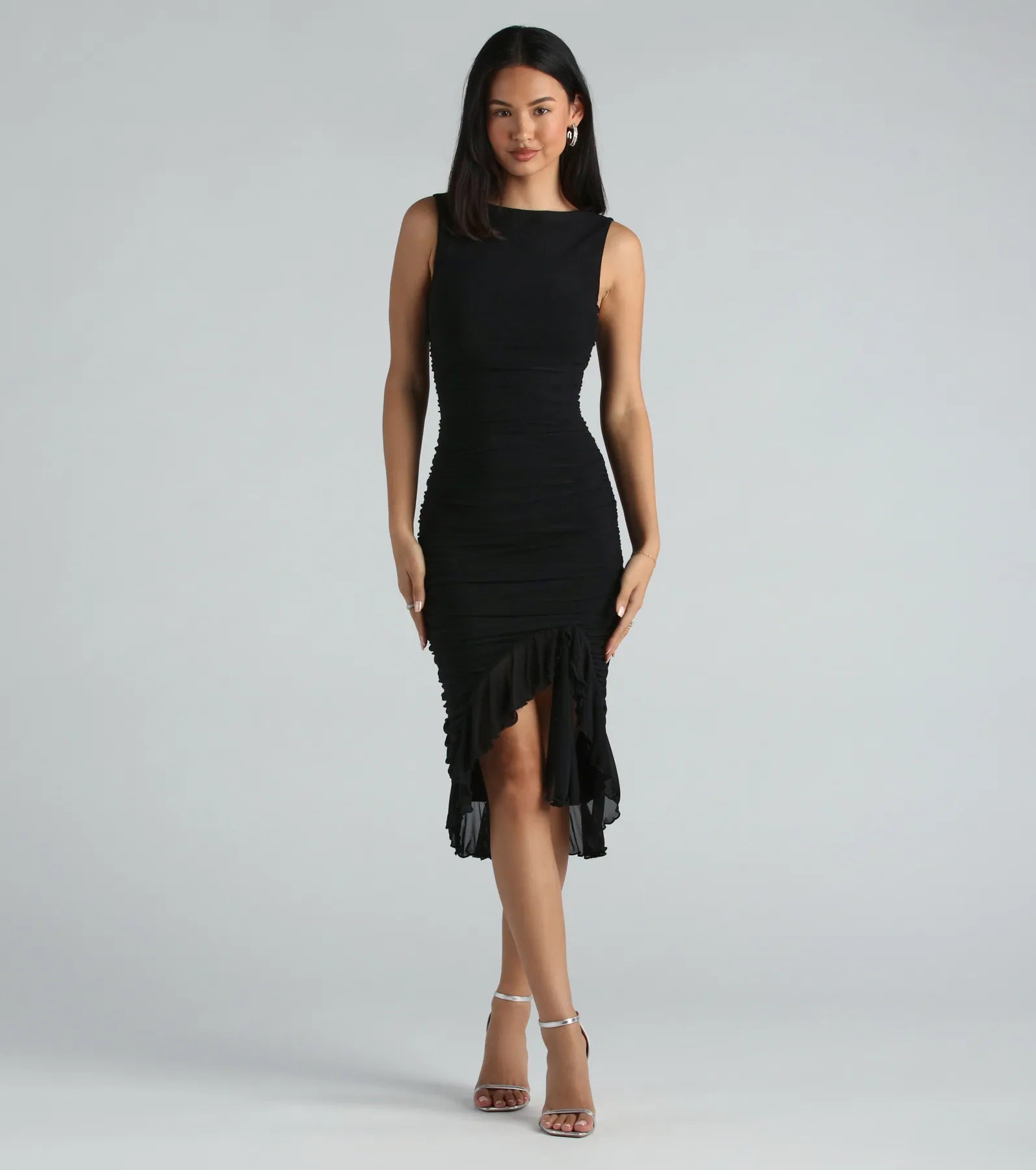 Casey Formal Mesh High Neck Ruffle Midi Dress