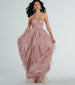 As romantic as it gets. the Charlize A-line formal dress brings dreamy fairytale allure to black tie weddings. prom. and balls! Make your grand entrance in this stunning floor-length gown crafted from floral lace and airy tulle fabric. you'll feel like a work of art. The strapless sweetheart neckline offers a non-slip grip lining and a flattering look while the built-in padded underwire bust eliminates the need for a bra. With a corset trim bodice enhancing your figure and a voluminous tulle ruffled A-line silhouette. this formal dress is stunning from every angle! Complete the look with dainty earrings. a ring set. and strappy heels for an unforgettable night.