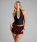 Look and feel charming in this lace skort designed with flirty ruffles and knit-fitted shorts for coverage....