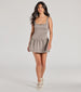 A sleeveless plaid romper features a square neckline adorned with a velvet bow and a flattering form-hugging...