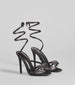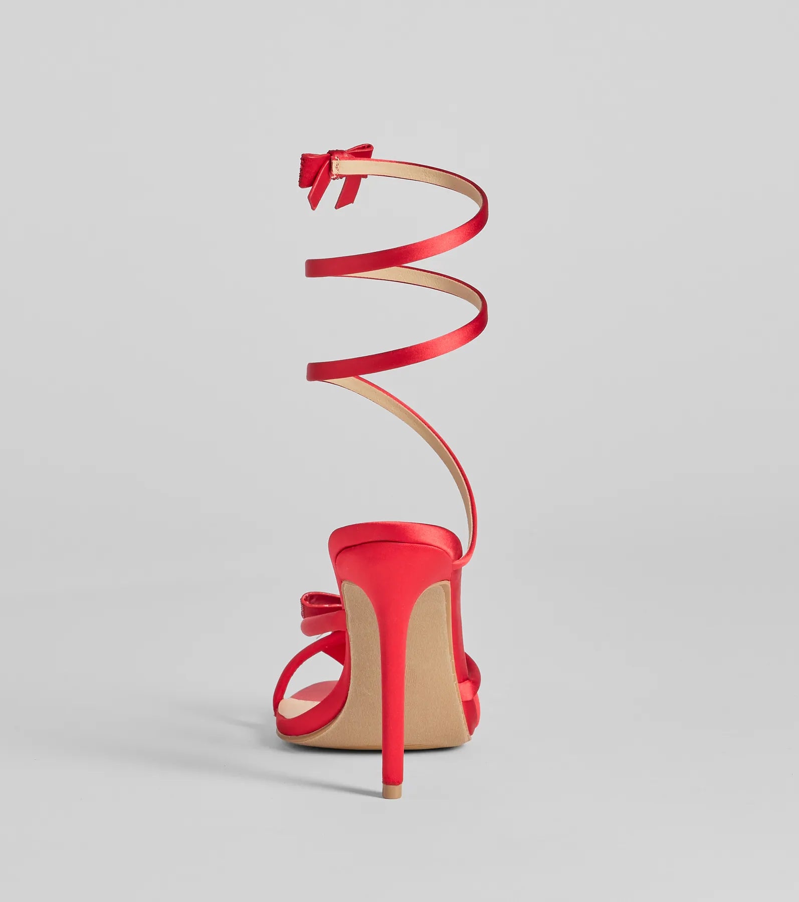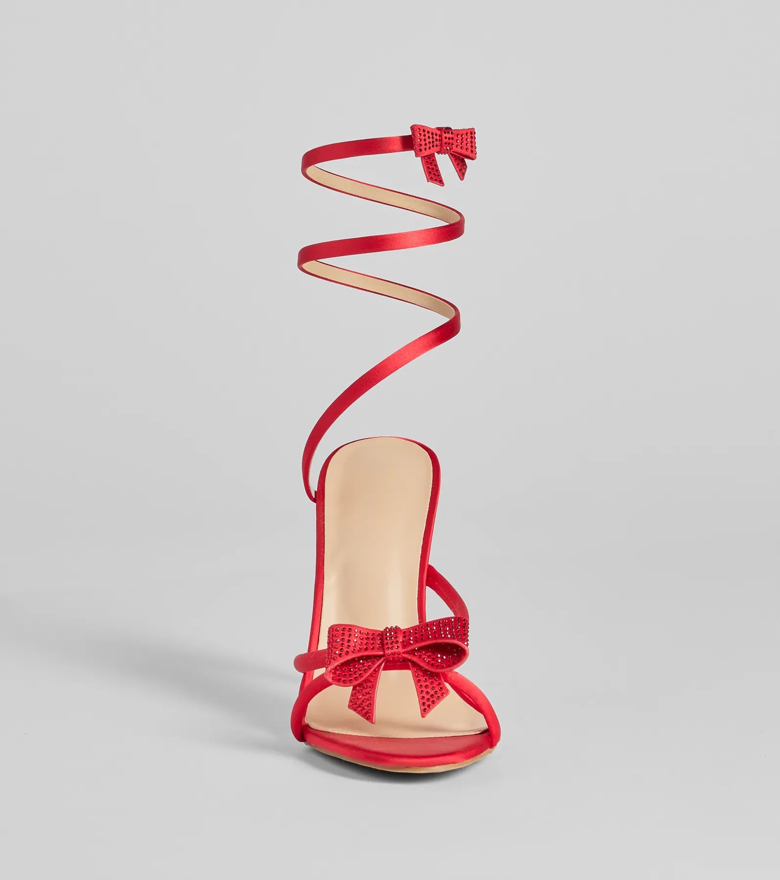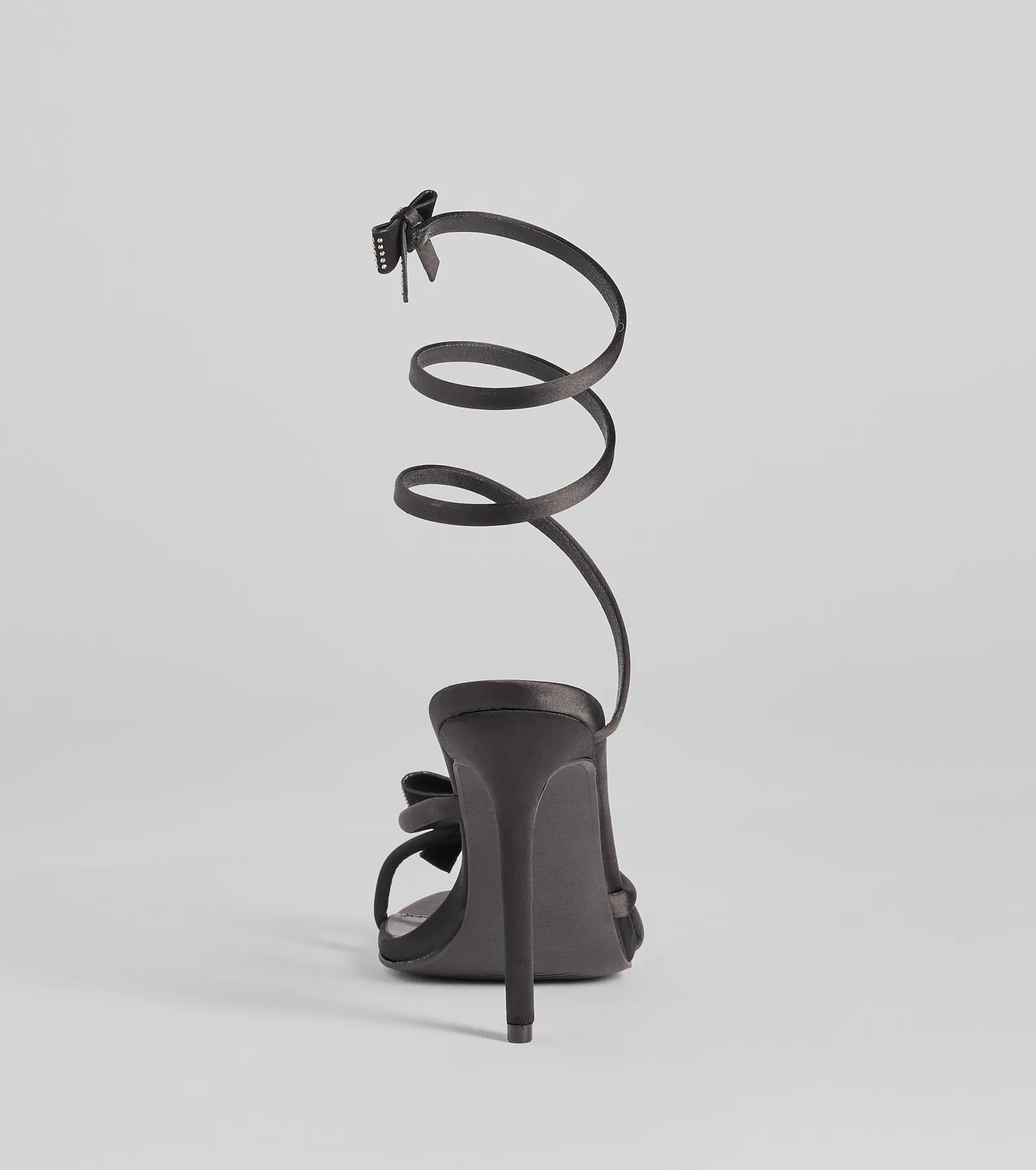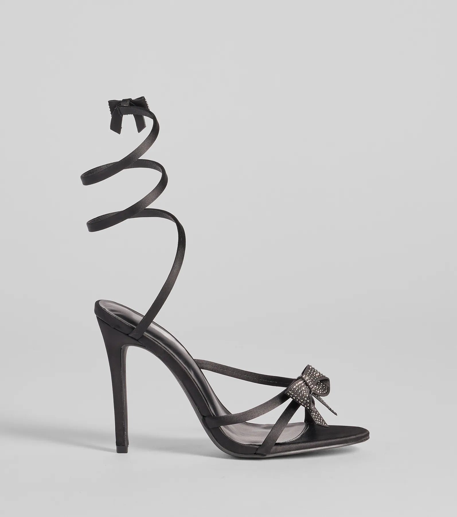 Turn heads in these bow spiral stiletto heels. Flaunt the rhinestone bow and wrap-around strap. Perfect for...