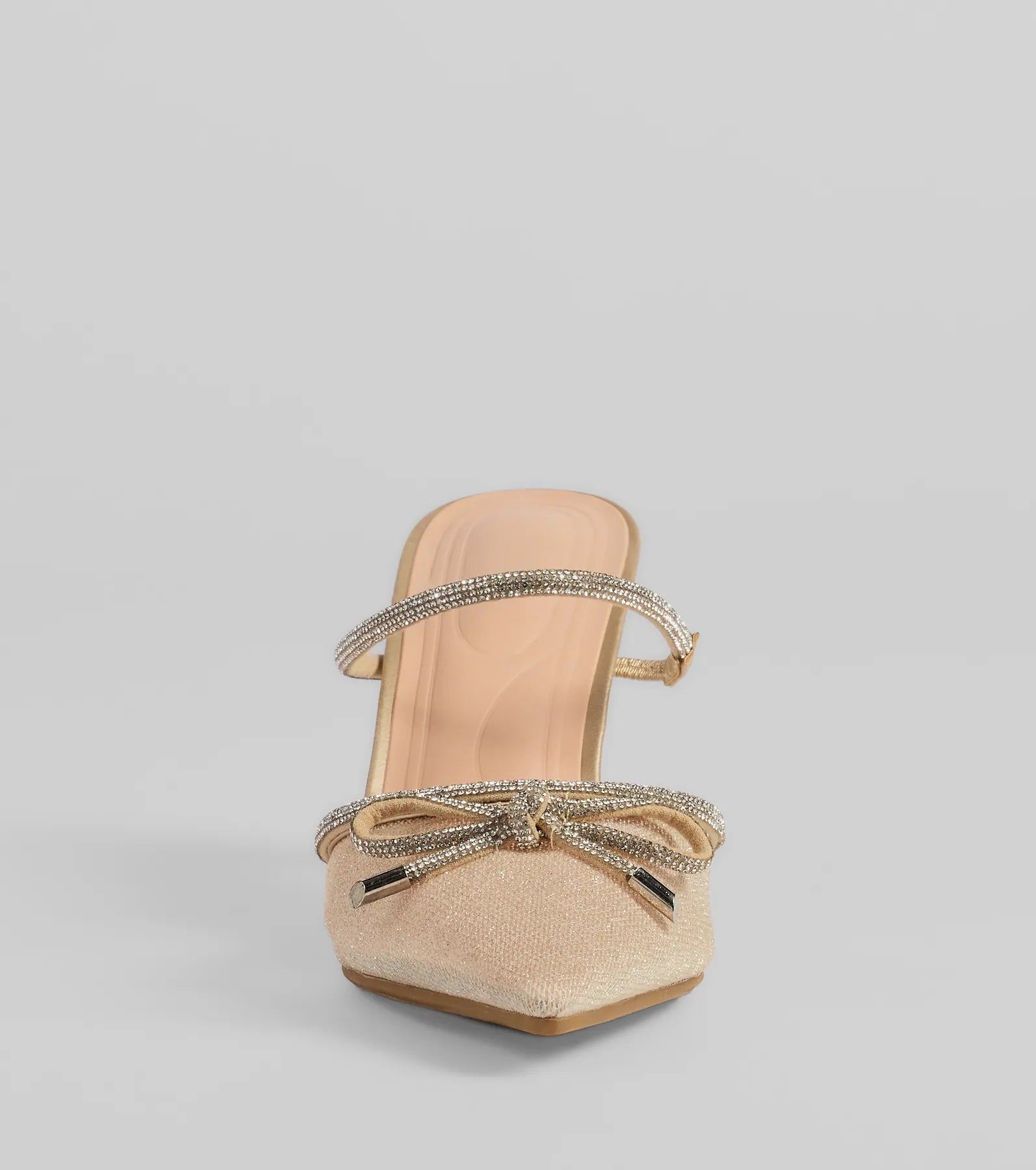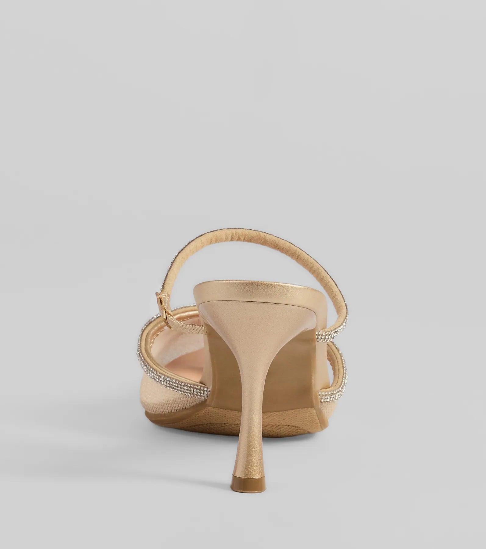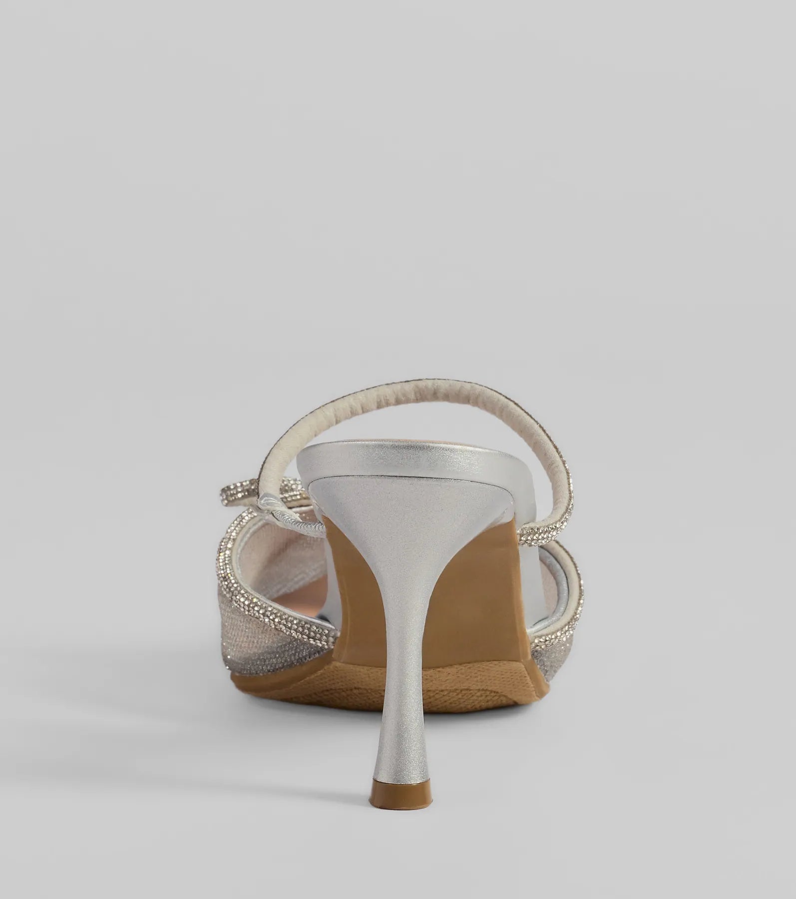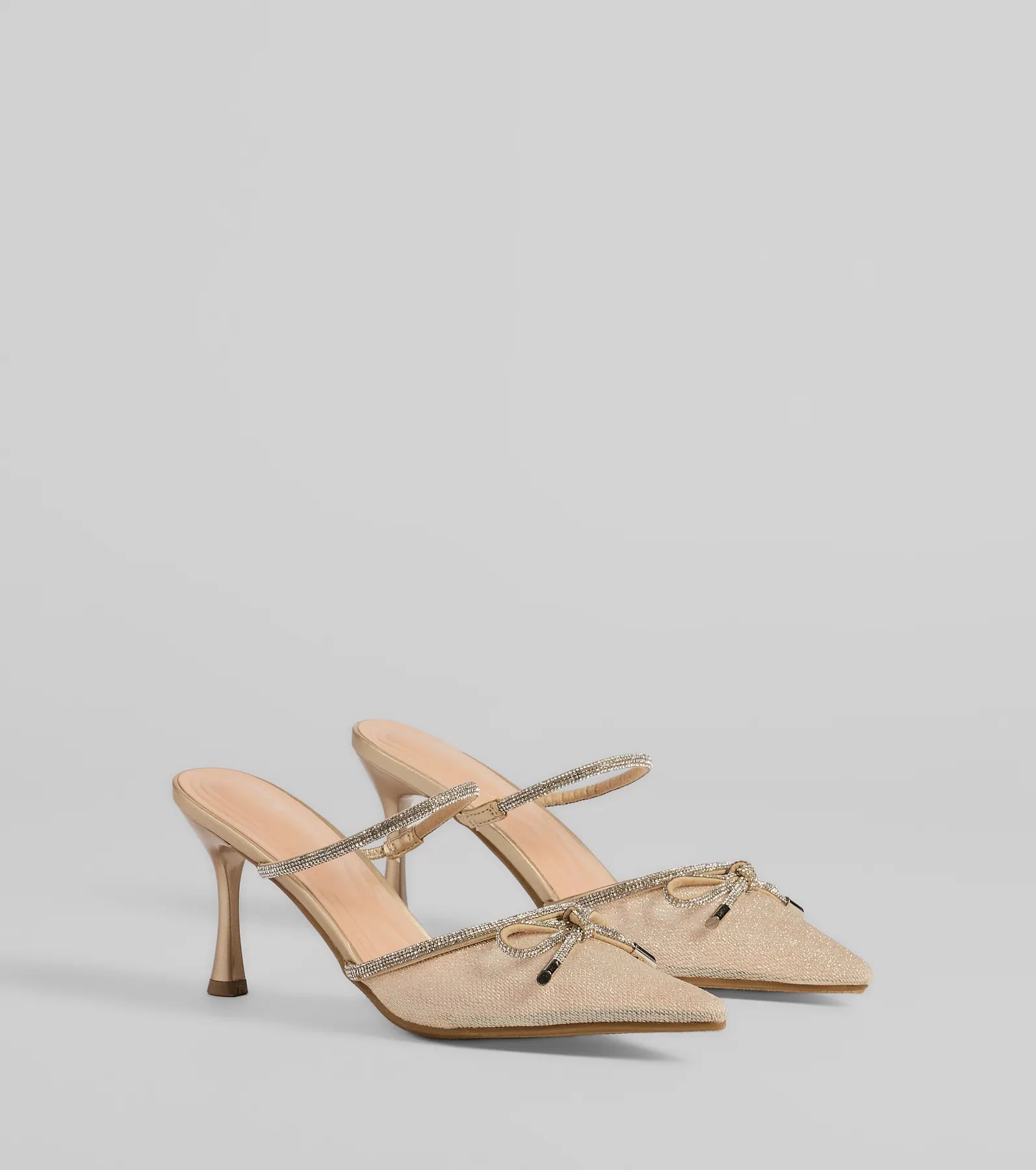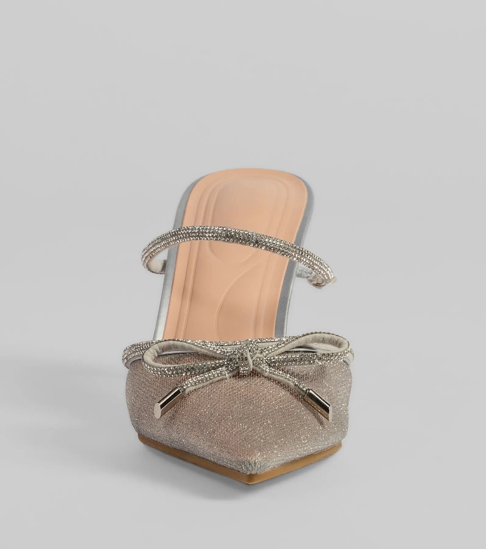 Fit & Features 3" Stiletto heel Metallic faux leather material Closed pointed toe. sheer glitter mesh material...