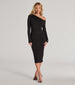 Classic and sleek. this stretchy knit midi dress features an asymmetric off-shoulder neckline with long fitted sleeves....