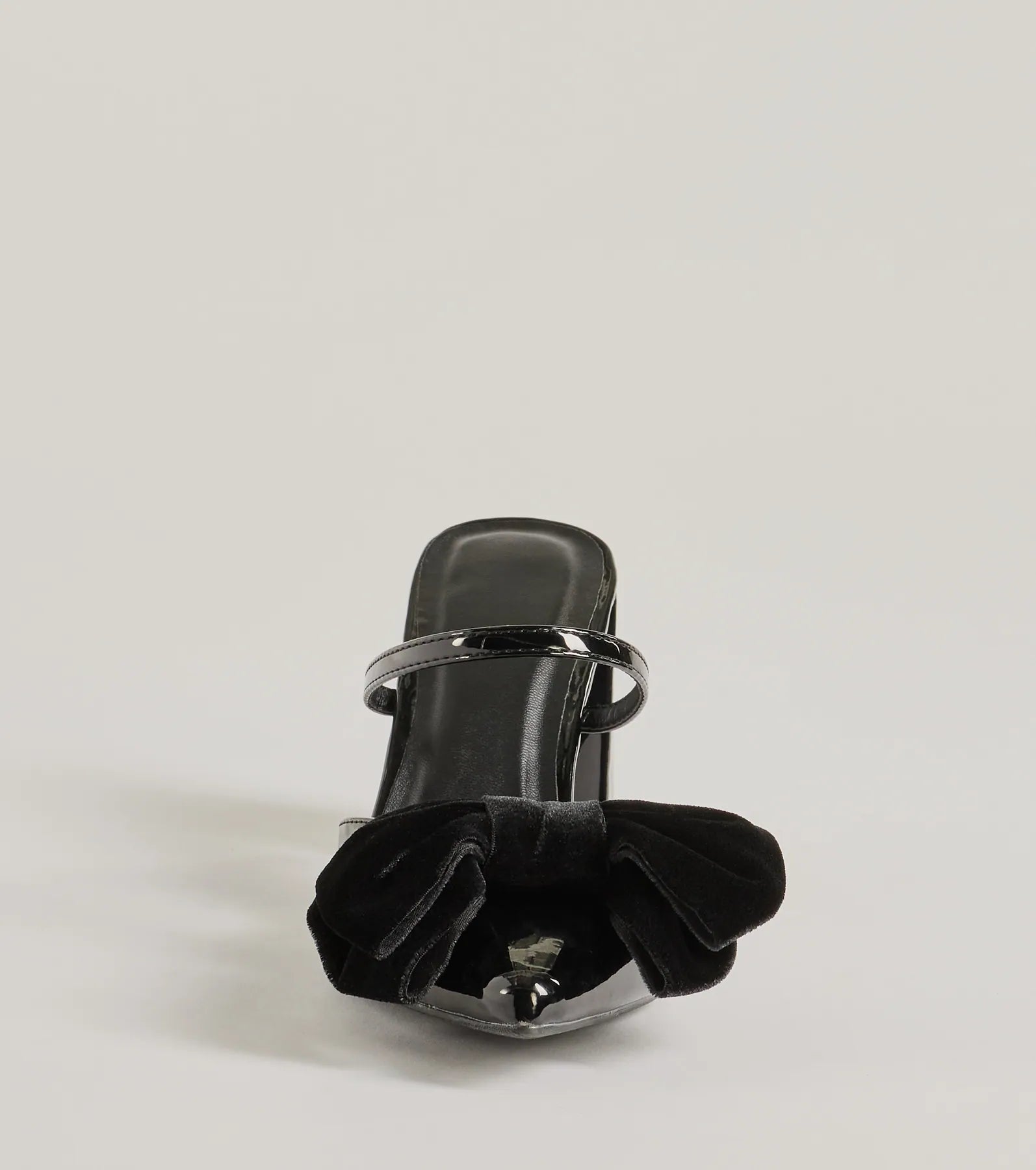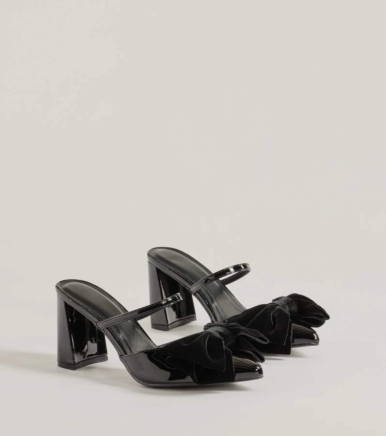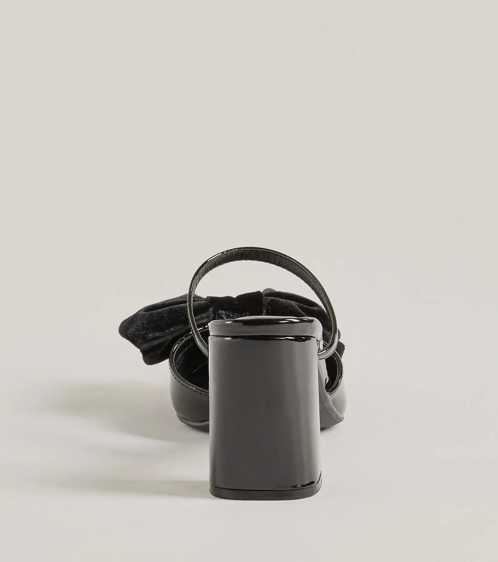 Fit & Features Block heel Single strap accent Closed pointed-toe Velvet bow accent Faux patent leather material...