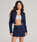 This cute cropped denim jacket features a classic collared neckline. a zippered front closure for a secure...