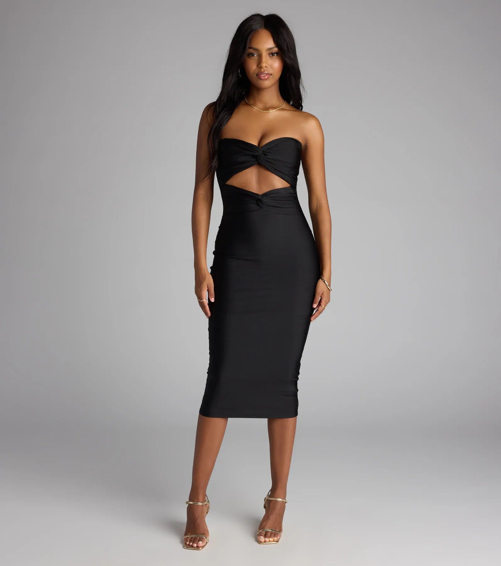A little cutout never hurt anybody. This strapless midi hugs your curves with a sleek silhouette and...