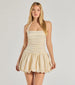 The woven satin skater dress features a sleeveless halter neckline with a halter neck tie. a square...