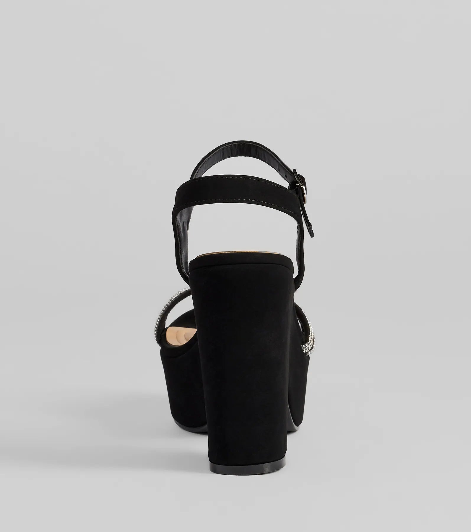 Elevate your look with dazzling spotlight rhinestone platform heels. Featuring a block heel. triple-row rhinestone straps. and...