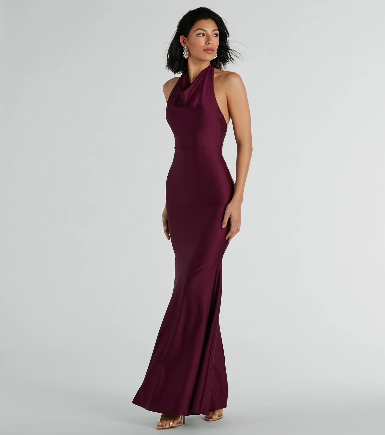 Timeless with a sexy twist! The Diane formal long dress is a sophisticated choice for bridesmaids and wedding or black tie party guests! She features a sultry cowl halter neckline that flaunts your femme allure. a neck strap with dual button closures. a sexy open back. a curve-enhancing backside ruched seam. and a flattering mermaid silhouette and floor-length hem. The formal maxi dress is crafted from a smooth knit fabric that fits like a glove and offers plenty of stretch. Complete the look with earrings and a clutch.