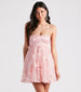 Dreamy and whimsical. this floral party dress is an ethereal style you need! Perfect for wedding showers. sweet sixteens. and school dances. It features a sleeveless square neckline. adjustable spaghetti straps. a low back with a chiffon bow tie closure. and an adorable and flattering babydoll short-length silhouette. The dress is composed of airy sheer organza fabric with delicate flower appliques and embroidery with multiple organza and stretchy knit linings. Complete the look in fringe earrings and rhinestone bow mules.