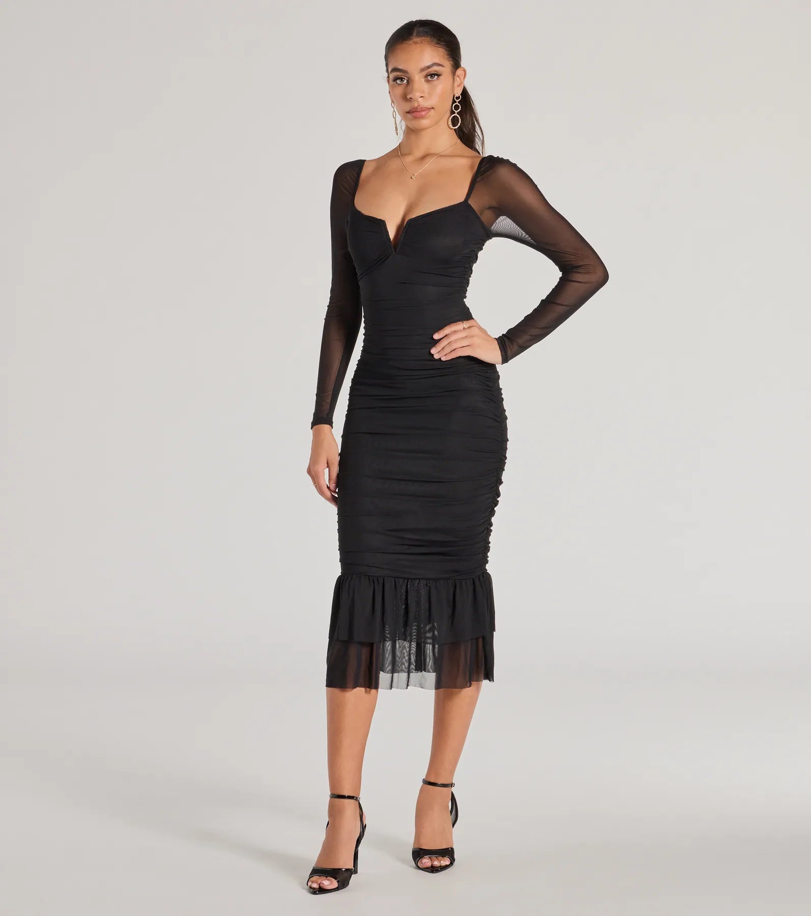 Elegantly chic. this ruched mesh midi dress features a square neckline with a V-wired center. sheer long...