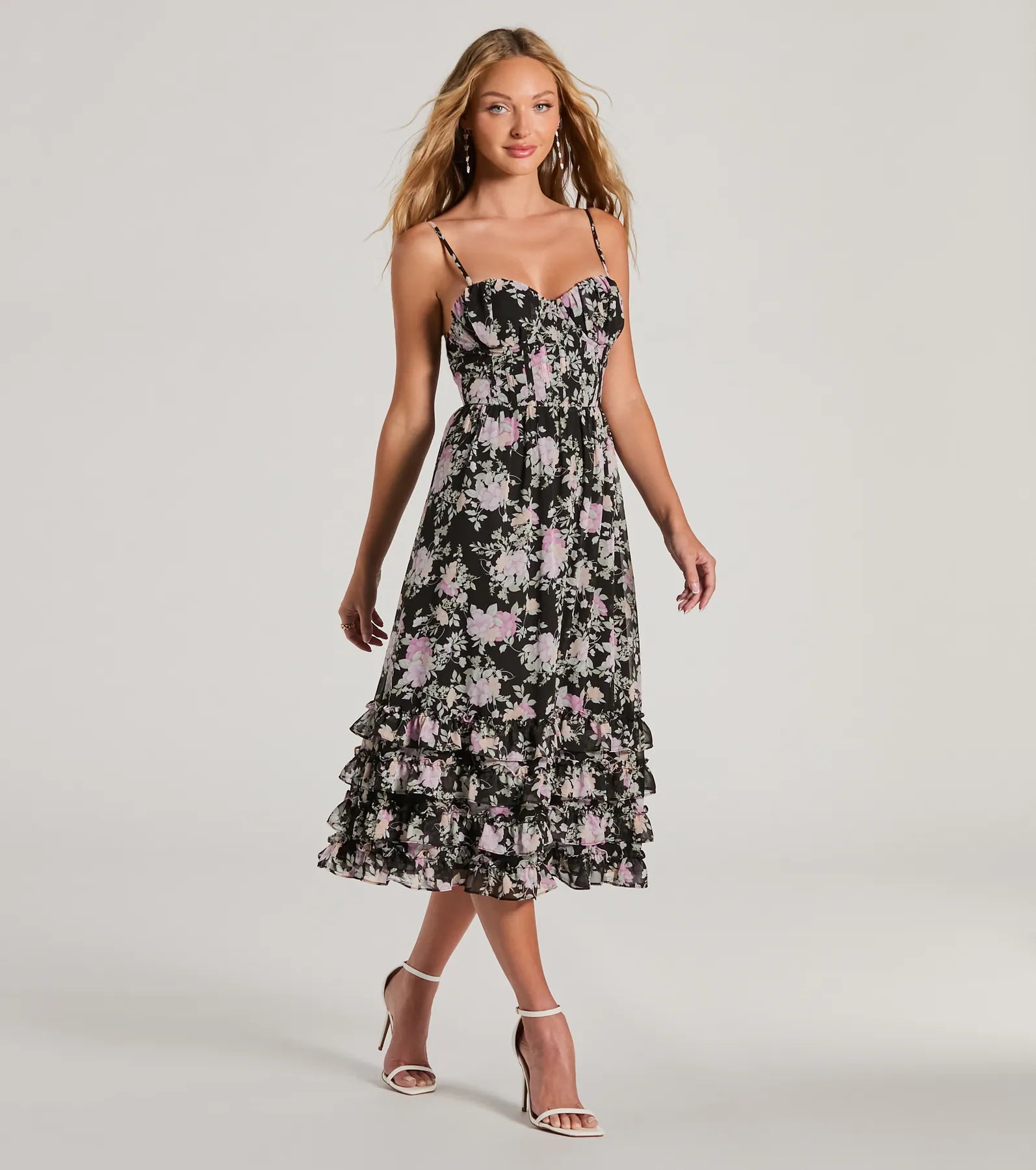 Take your soiree looks up a notch with this floral midi dress perfect for showers. rehearsal dinners....