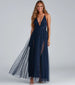 Dress as the princess you are with our breathtaking Elisabeth dress! She is a floor-length evening gown with a plunging V-neckline and thin adjustable straps that create a cross-back design. Her wide empire waist leads to a floor-length skirt that dances around your ankles. She is composed of pleated tulle fabric with a sheer appearance and a thin knit lining that features two front slits. Elisabeth offers a moderate stretch and includes a hidden zipper. Complete the look with a rhinestone clutch and a dainty rhinestone bracelet.