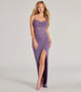 Special OccasionA sleeveless glitter formal dress features a sultry cowl neckline and sheer bodice with flexible boning...