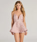 Enchant everyone in this floral jacquard skater romper showcasing a plunging V-neckline and a short skater skirt...
