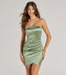 This sleek satin-knit mini dress features a strapless straight-across neckline. pleated detailing at the front to accentuate...