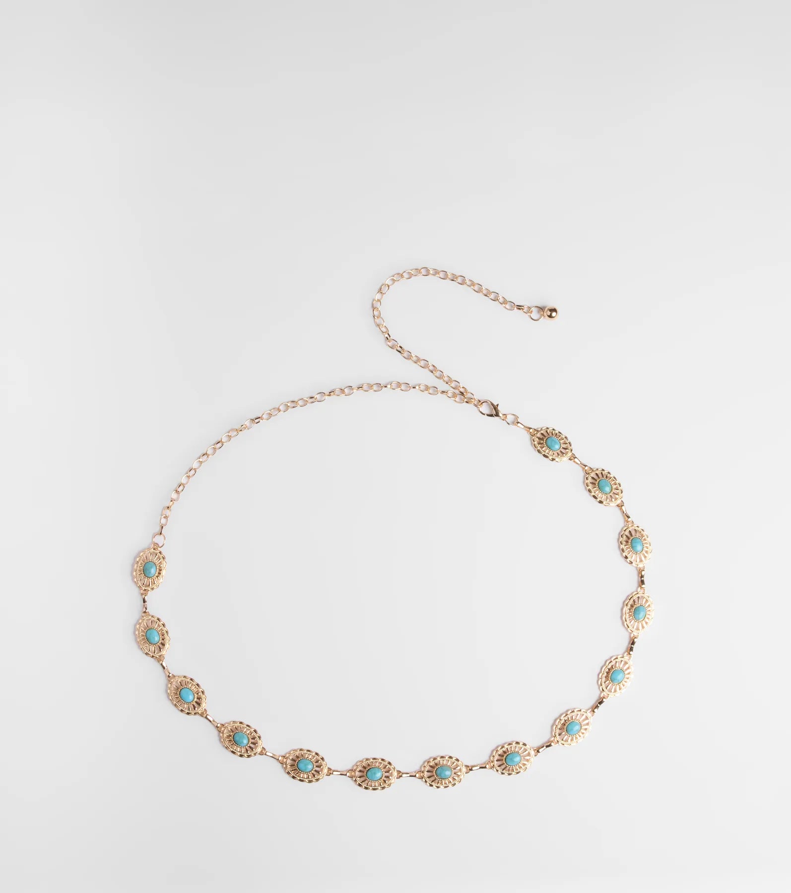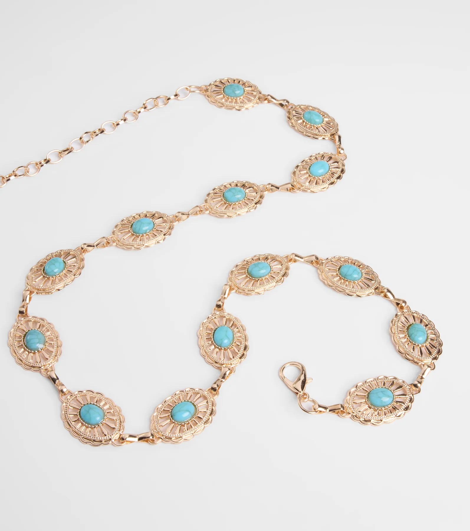 Accessorize your ride with this statement western chain belt featuring unique colored stones. oval-shaped charms. and an...
