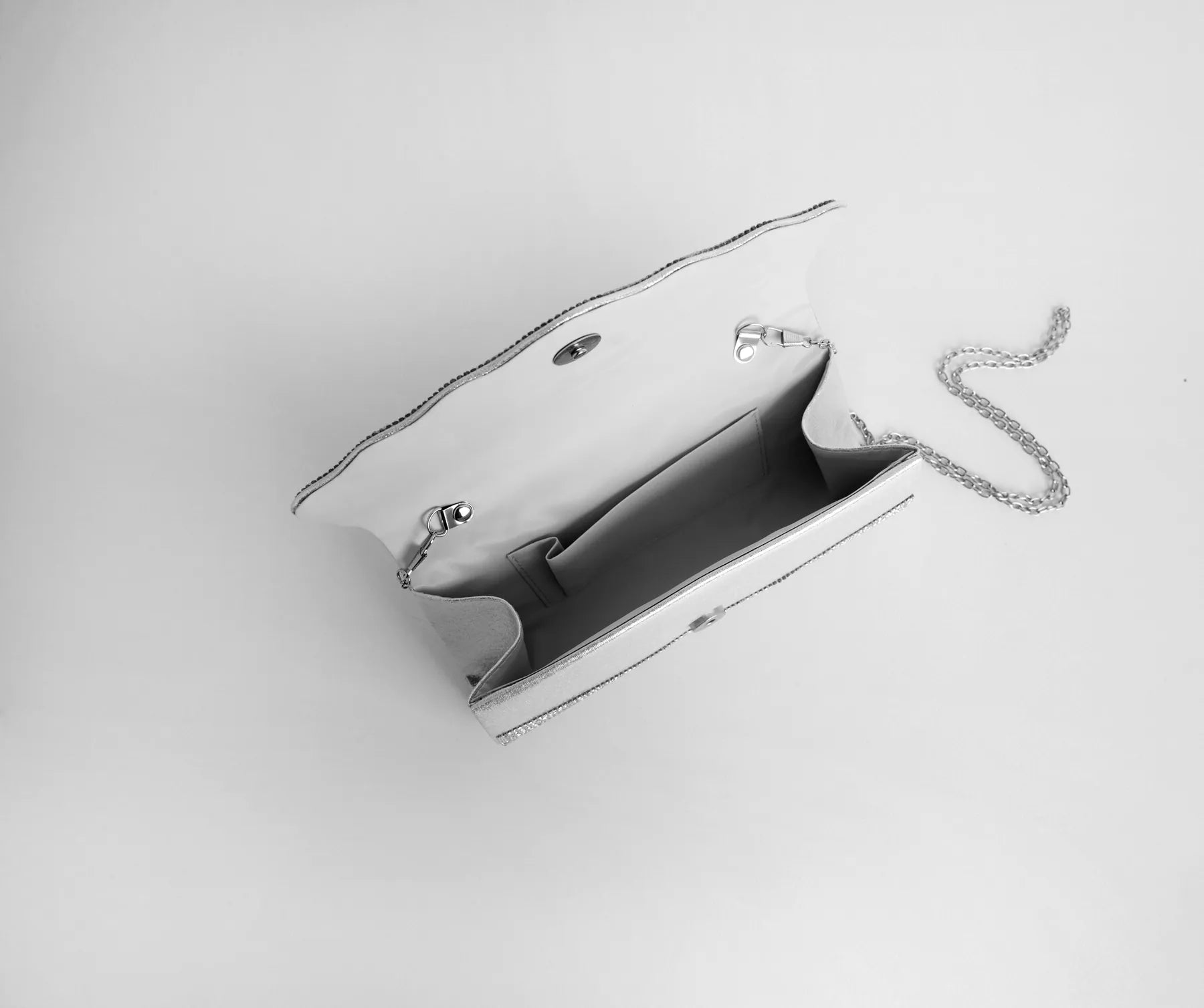 Bring some bling to the party! This clutch features a rectangular shape with slanted sides. and an...