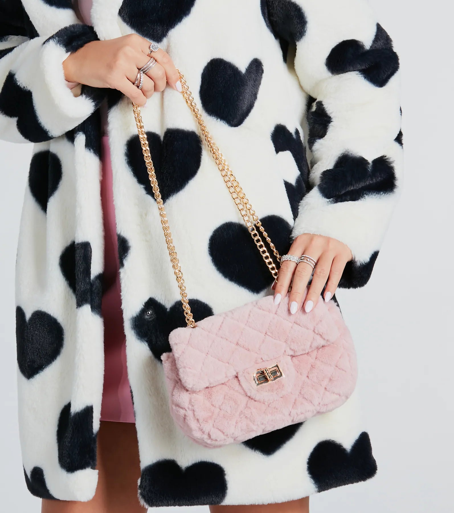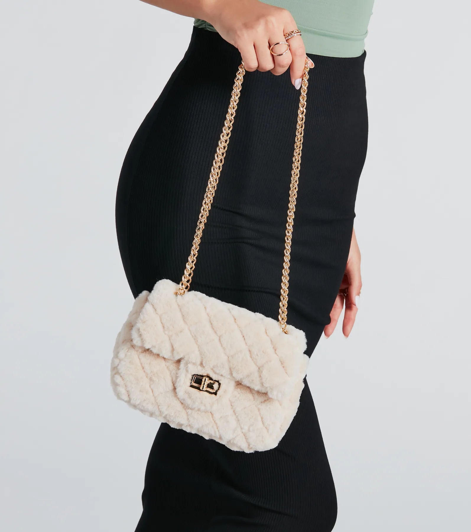 Look fashionable and fab with this faux fur crossbody bag! This quilted bag features a stylish chain...