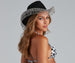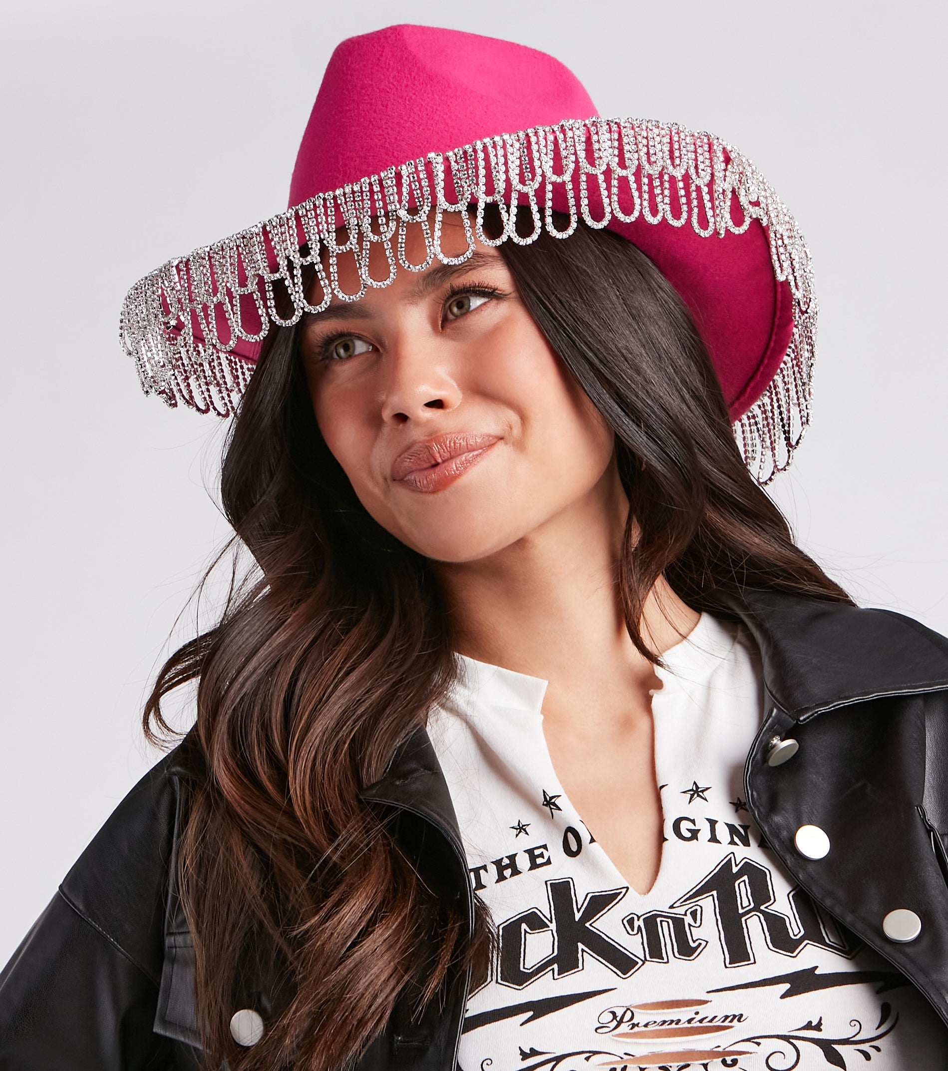 Round up your glam side in this cowboy hat featuring a rhinestone edge fringe. curved brim. and...