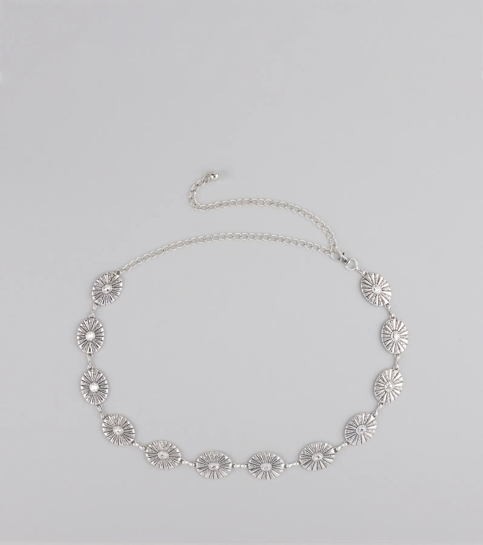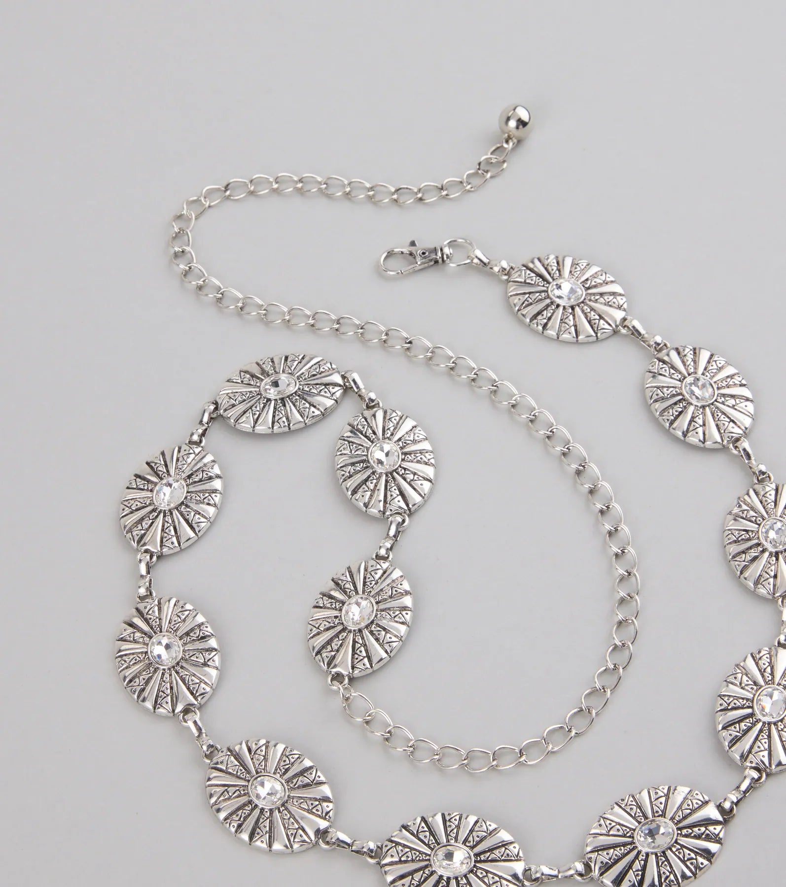 Elevate your outfit with this statement concho belt. where Western charm meets glamorous sparkle. The eye-catching rhinestone...