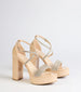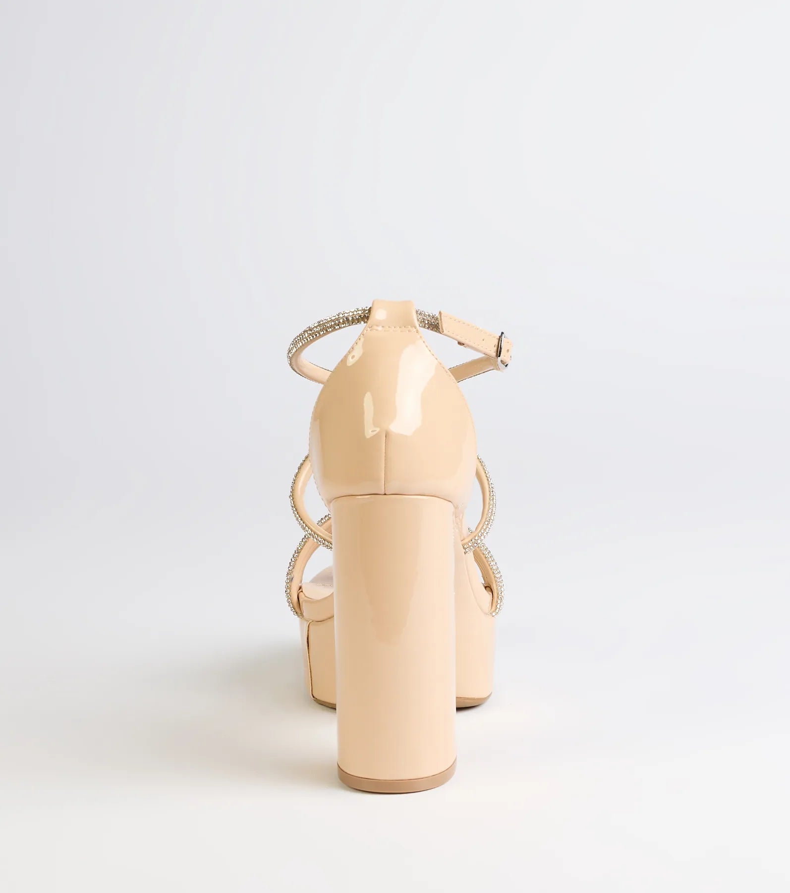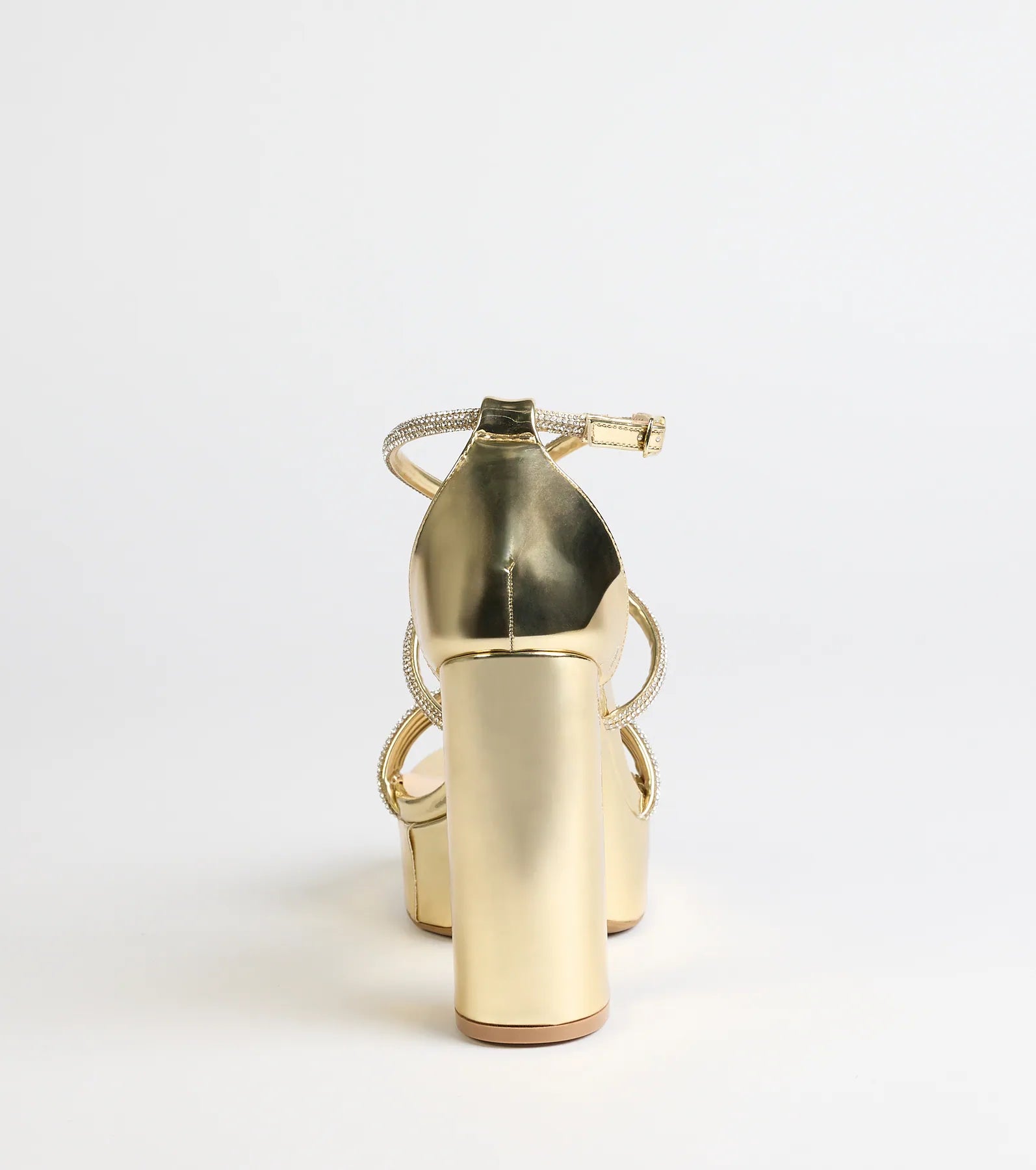 Step out and radiate a glam sheen at parties in these metallic platform heels with a rhinestone...