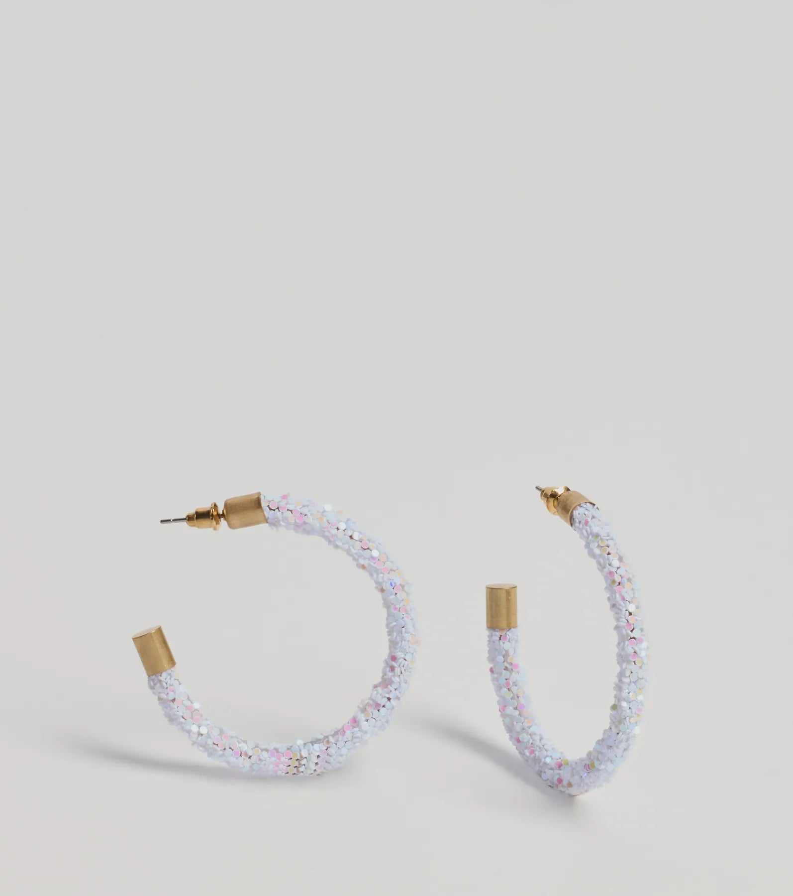 Nail those vibes with glowing nights iridescent hoop earrings. Large hoops with glitter accents and post-back closure....