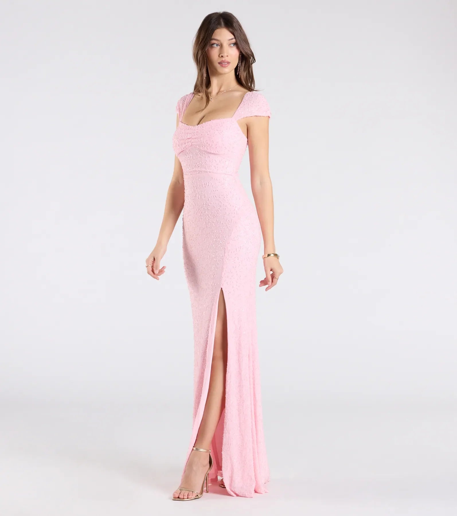 Greta Short Sleeve Lace-Up Slit Beaded Formal Dress