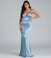 Allure them in the chic Heidi dress to make a head-turning impression at your next special event. The formal dress features a sleeveless plunging V-neckline. a built-in padded bust for comfortable support. and dual spaghetti straps. The straps lead to a bold open back to show off a hint of skin and sleek lattice straps that let you adjust the fit. The bodice of the dress leads to a floor-length mermaid silhouette that is complemented with vertical seams to streamline your shape. Complete your outfit with rhinestone earrings and strappy stilettos.