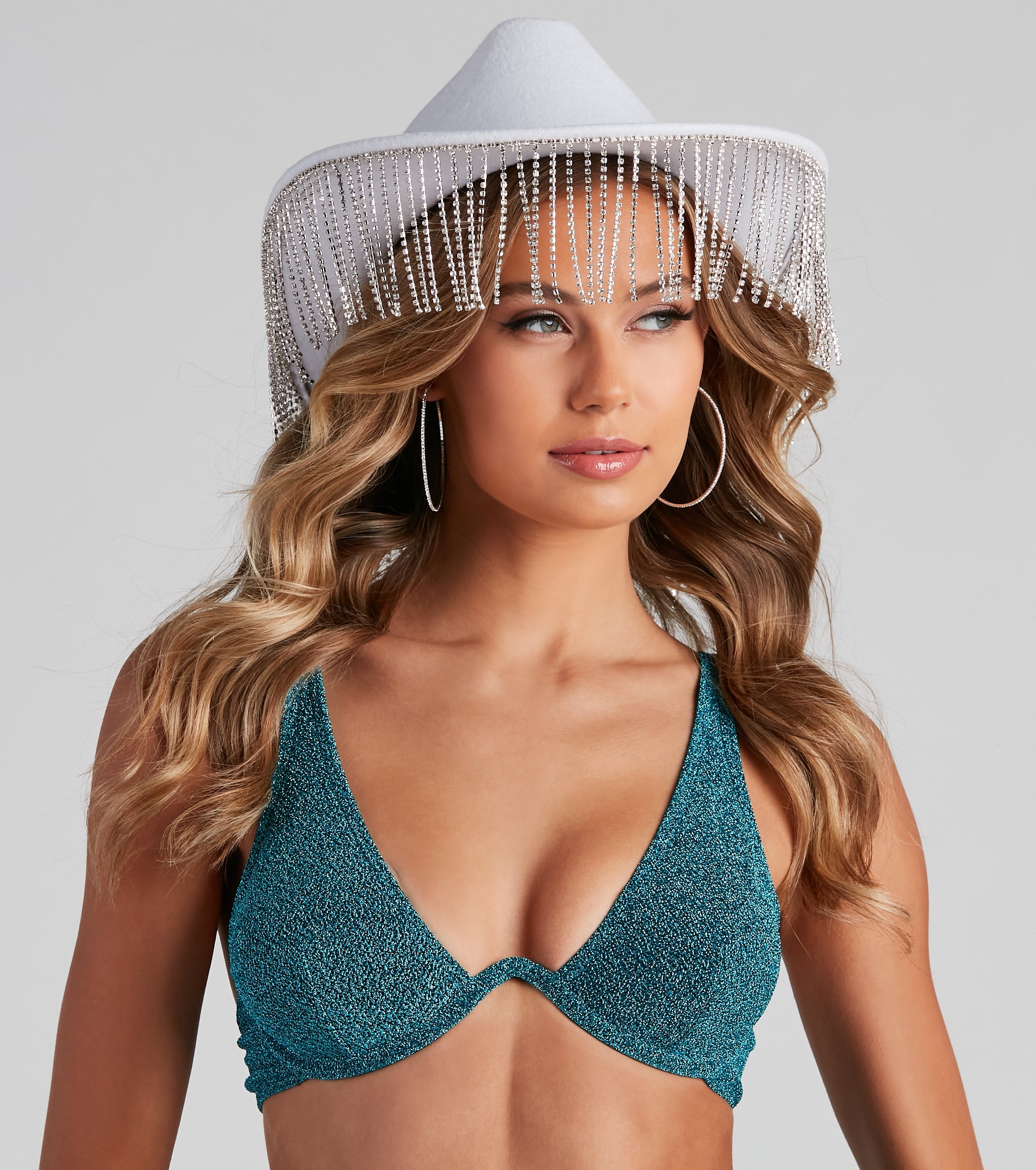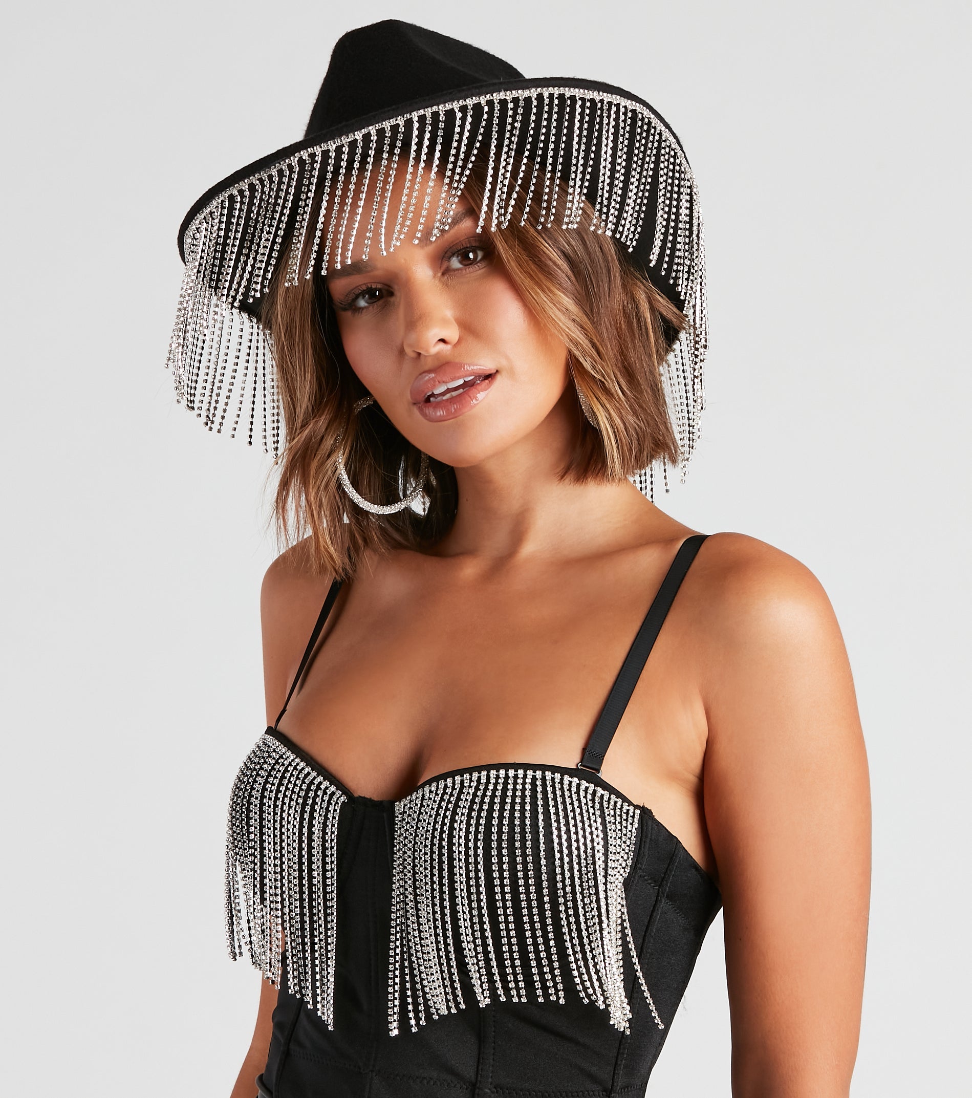 Home on the range and looking glam in this cowboy hat featuring rhinestone fringe and a curved...