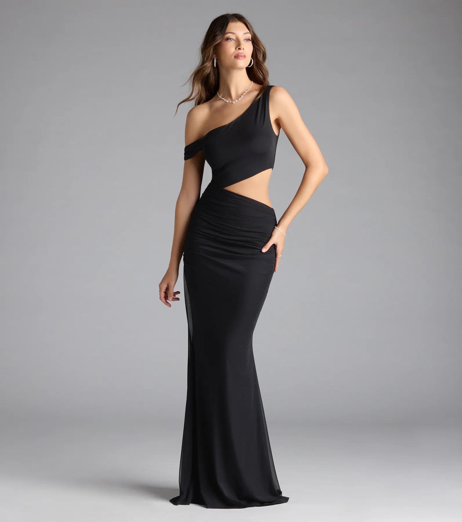Idella One-Shoulder Cutout Mesh Formal Dress