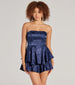 A strapless satin romper features a corset bodice with flexible boning. a flirty tie waist. and a...