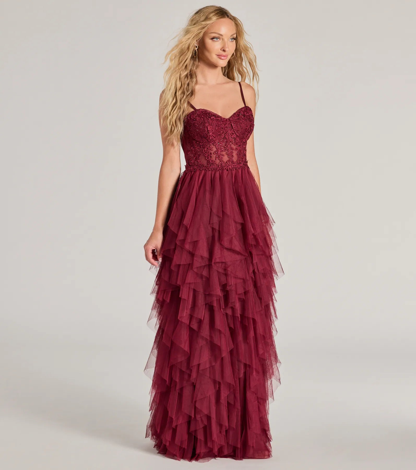 Special OccasionLive out your fairytale dream in the Keyla floral applique tiered ruffle tulle gown for an...