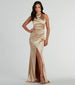 You'll make jaws drop in the Kourtney satin formal dress as a gorgeous bridesmaid or black-tie party guest! Made from silky satin that exudes luxury. she boasts a high cowl neckline with halter tie straps creating a sophisticated silhouette. while the open back adds a touch of sensuality. Side pleated seams and a high front wrap slit complete this exquisite mermaid gown. Make a statement at your next special event in this floor-length stunner and complete the look with rhinestone earrings and heels.