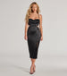 Special OccasionShowcase your gorgeous silhouette in the Leona satin bodycon midi dress featuring a sleeveless sweetheart neckline...