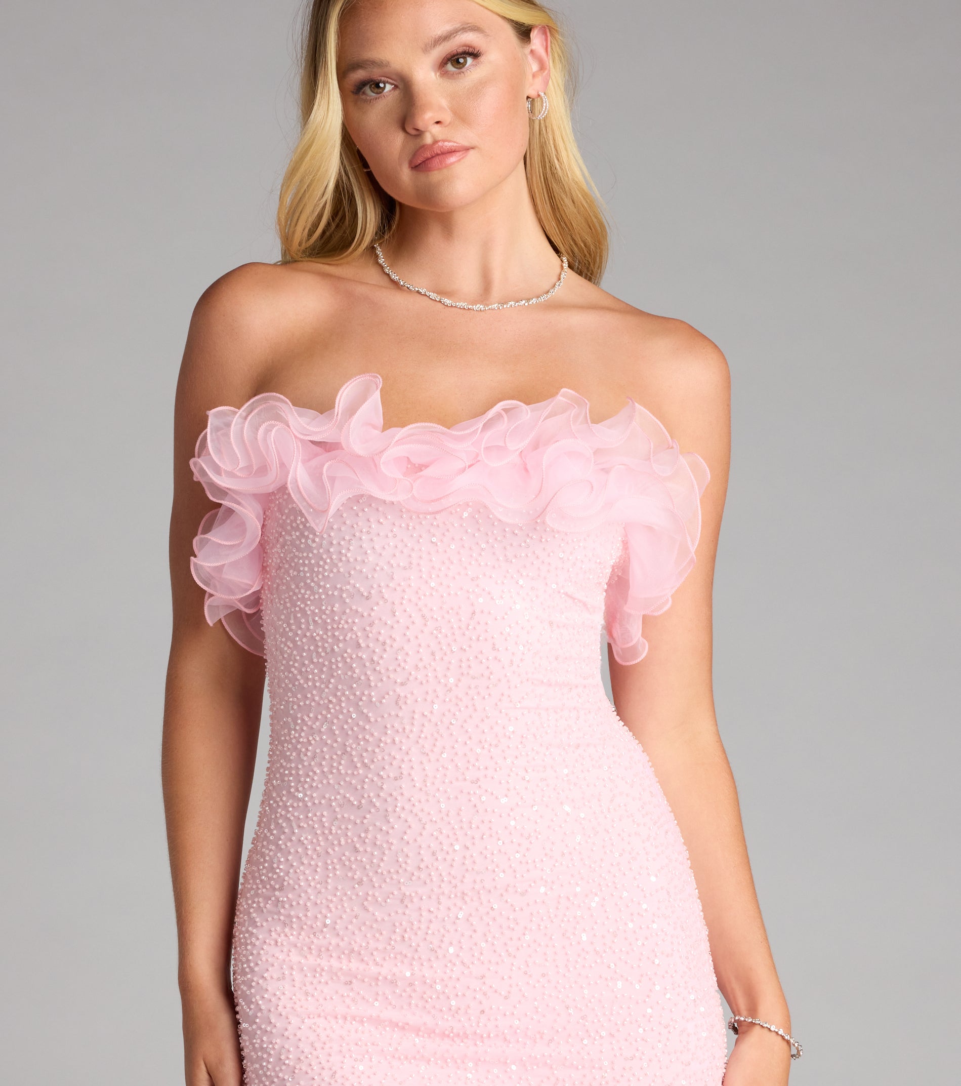 Special OccasionThe Linda dress turns heads with its sculpted bodycon fit. intricate beaded embellishments. and romantic ruffled...