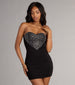 Spotlight ready—this strapless mini dress is all about shimmer and shape. The rhinestone-studded heart and bodycon fit...