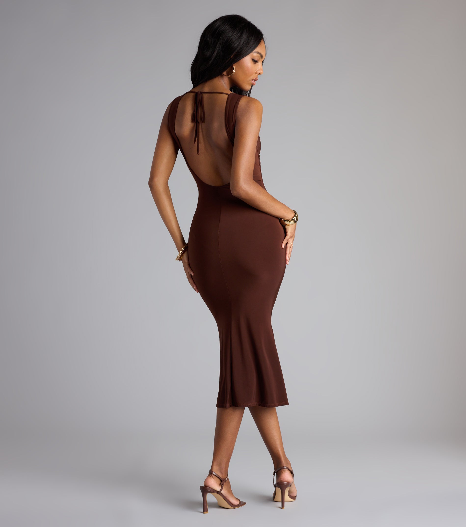 From classy neckline to tie-back surprise. this bodycon midi dress brings unexpected drama to this sleek silhouette....