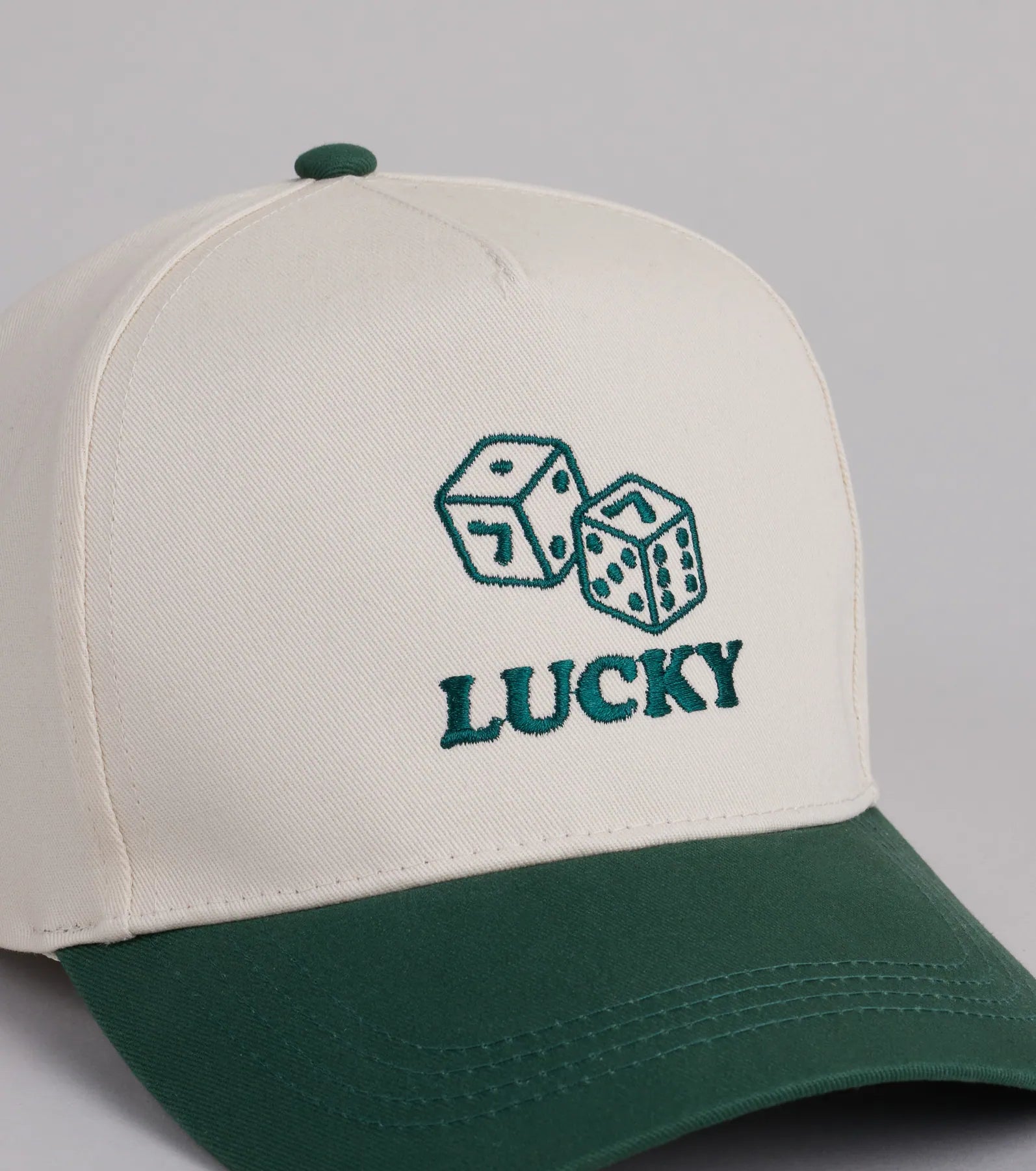 Serve all the lucky vibes in this trendy two-tone baseball cap featuring a dice embroidered graphic with...